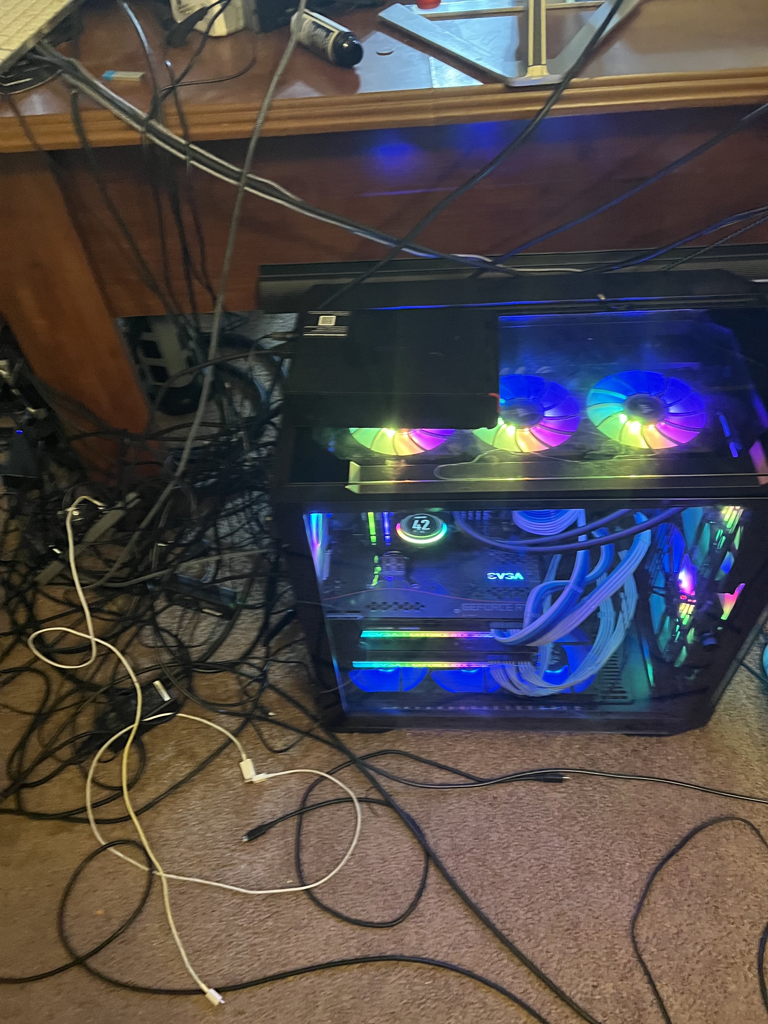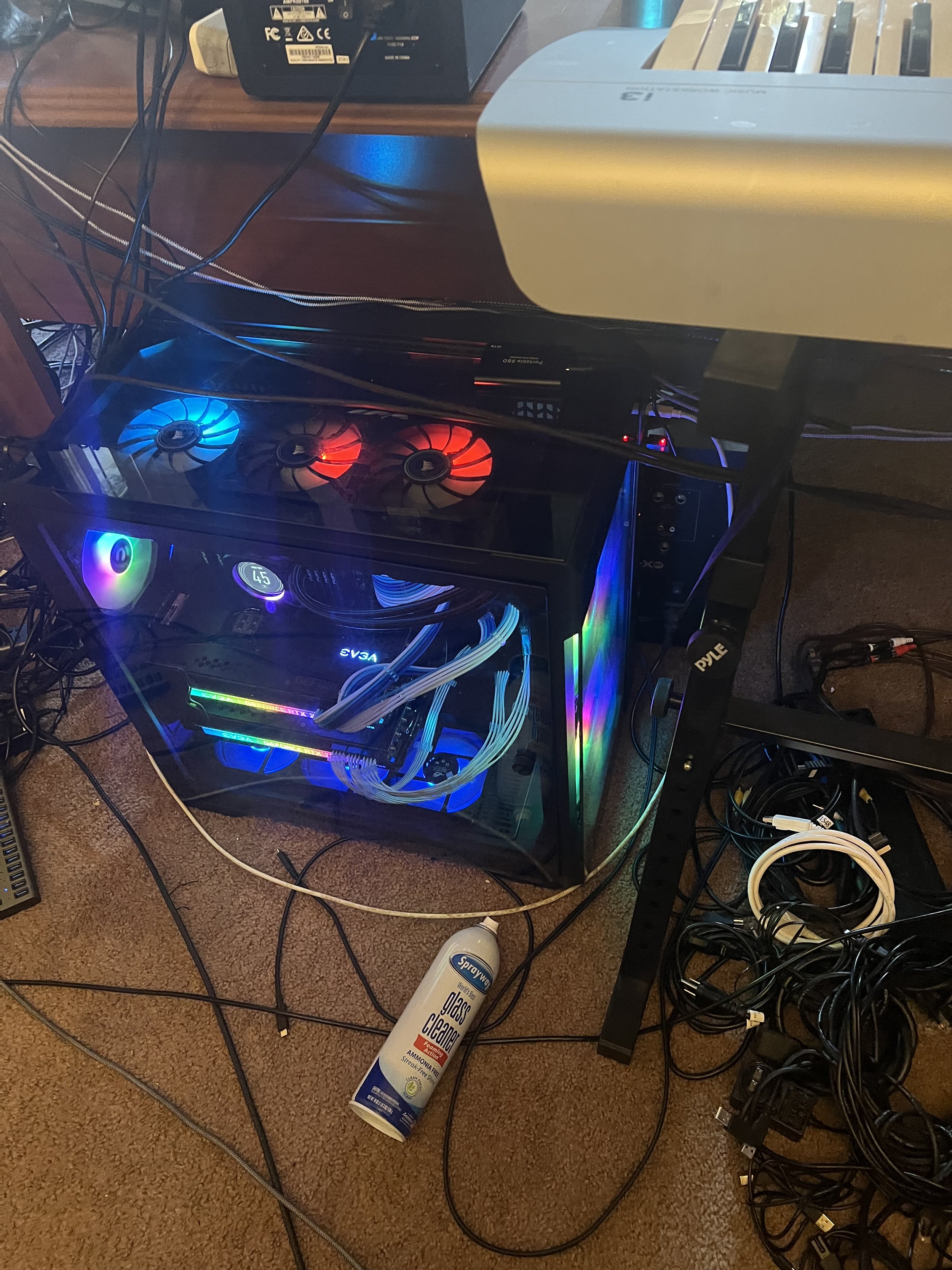 Well, she actually came home with me a month ago, but, I’m still babying her. She has a beautiful, black polished steel frame, so many cooling fans you could cook a steak on them, a 24-core Threadripper Processor, a TRX40 Designare Motherboard, and two — COUNT ‘EM, DARN YA! — beautiful RTX3090 graphics cards hooked together with NVLink. It also has 256GB of RAM, an 8-TB SATA SSD drive, and a 10TB Toshiba (spinning) hard-drive. As to what it’s connected To, well, I got a top of the line surge protector; and I’ve got a TASCAM 16x08 audio interface plugged into it. Network WiFi COLOR laser printer. And right now, I’ve also got hooked up: My Traktor DJ software control station, with turn tables and everything . . . My Native-Instruments “Maschine 2 Mk3” drum and dance controller; a Korg 13 Arranger workstation; a Nektar MIDI controller with 88 (piano-weighted!) keys, and, soon, I might be — might be, maybe — adding a Yamaha PSRSX900 Digital Arranger Workstation. In terms of software, she sports Windows 11, Object Desktop (to make MS Windows tolerable to interact with!), Adobe Creative Cloud, Adobe Substance Cloud, Cinema 4D 2023.1, Blender, iClone 8 and Character Creator 4, and a few other 3D and 2D animation packages. In terms of musical software, she sports Cubase 12, Finale 27.9, Sibelius 2023.1 (for now), and the IK Multimedia TOTAL STUDIO MAX 3 bundle of tools. Also, Superior Drummer with six expansion packs, EZ Keys, EZBass, and the Hexachords Producer Suite, the Vienna Suite Pro, “Composer’s Cloud” and OPUS to use its many sounds with, and finally, Waves Mercury. That’s right — the Big Kahuna of Waves plugin bundles, with over 400 high-quality plugins available for it! And last but not least, she has the Steve Slate Audio Bundle in her. For her speakers, I chose a pair of IROK Studio Monitors. For input, well, there’s the keyboard, about five different mice (because I like a variety of control “feels.”) And oh yeah — she has a Steve Slate Raven M-2 touchscreen digital mixer and a Wacom Cintiq drawing monitor/tablet. I think I came out smelling like quite a rose with this deal. I only wish that everyone had access to this kind of creative powerhouse tool . . . Then the world might be full of less scary school shootings, and instead of those, some pretty twisted, personally-expressive artworks. And I don’t think the artwork is gonna hurt anybody, unless it’s the cover of Pink Floyd: The Wall and you’re dropping acid. Which you should not do anyway. Remember what Arthur C. Clarke (the famous sci-fi writer, creator of both 2001 and 2010, as well as the designer of the first communications satellite, once said to everyone: “Drugs don’t heighten creativity; they simply dull the voice of your inner critic telling you to do better.”)